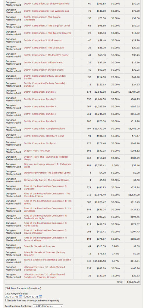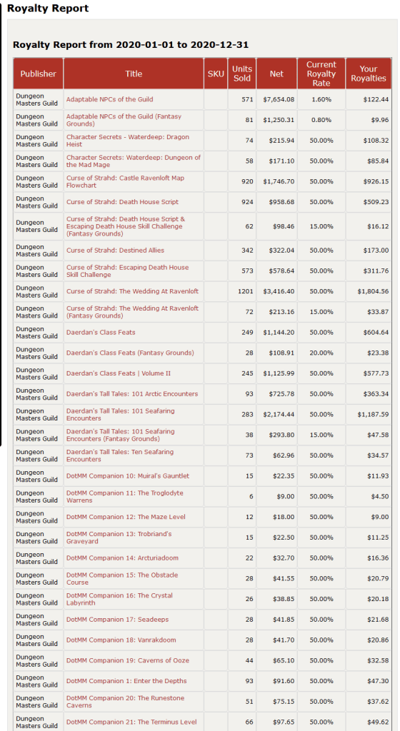 Come July 2021, I will have been publishing on the DMs Guild for three years. In these last two-and-a-half years, I’ve released over fifty D&D products, and the royalties I earn seem promising enough that I can return from teaching abroad to live skinny as a starving writer. This post is not a boast, nor is it an invitation for the IRS to audit me (pls no, I pay my taxes), but a simple sharing of my experience self-publishing Dungeons & Dragons products. Hopefully some other nerd reads this blog post and realizes that they too can fulfill their dreams of being a TTRPG designer or writer even while holding down a full-time job. In the year 2020 alone, I earned $25,835.28 from publishing on the DMs Guild (after having to give away half—yes, half—of my earnings to the website and WOTC). As an English teacher in South Korea, I make about $23,000 a year (after factoring in taxes and converting to USD). You read that right: I am making more than my actual salary.